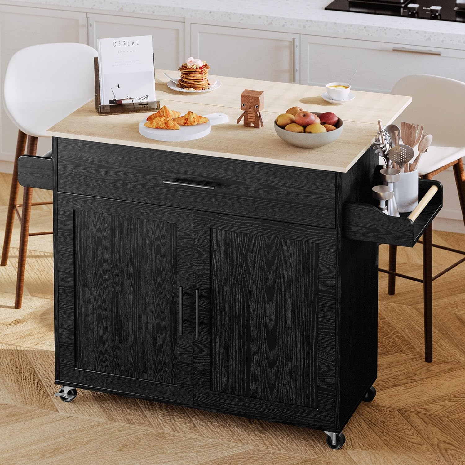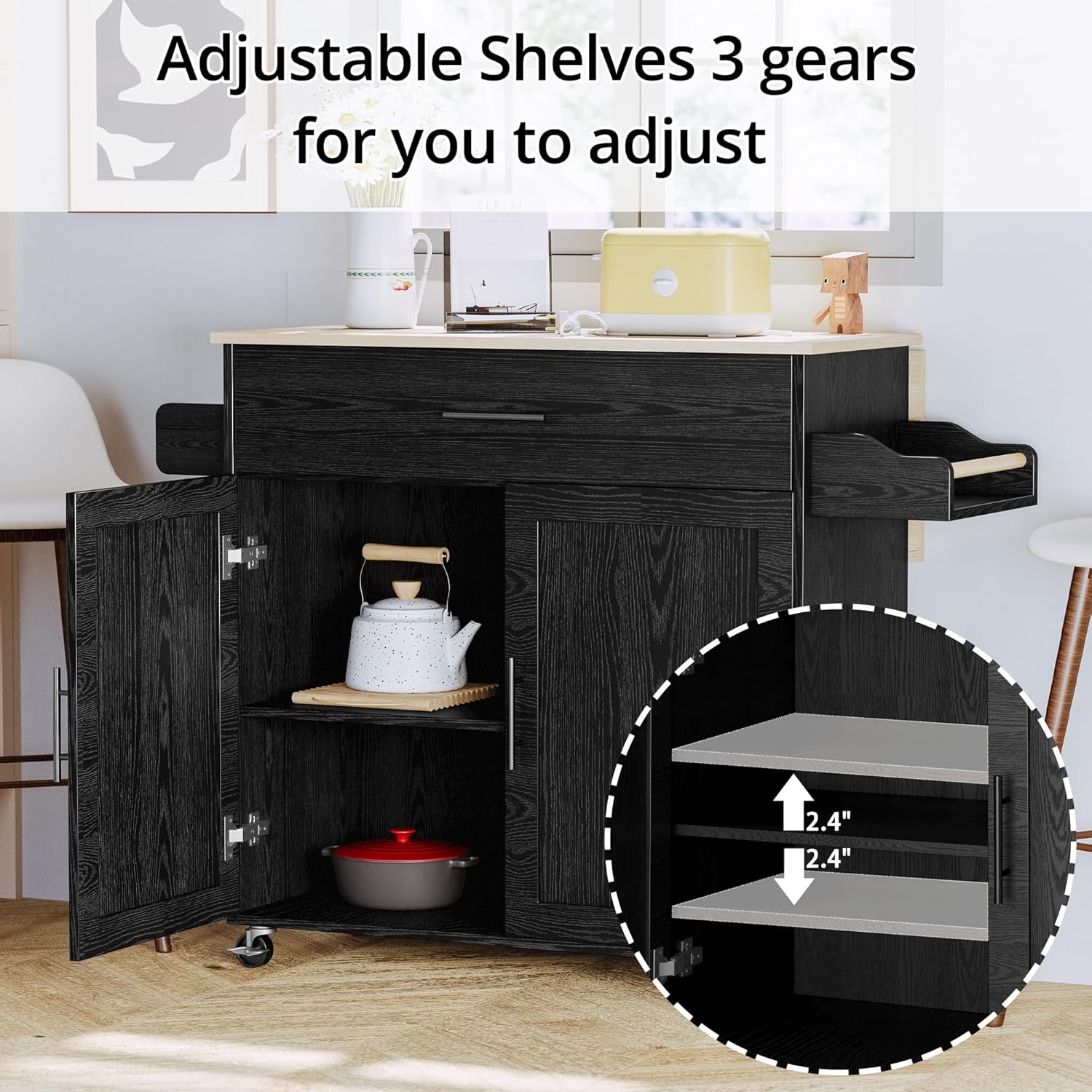IRONCK Kitchen Island with Storage, Rolling Kitchen Island on Wheels with Drop Leaf, Charging Station, 3 Open Spice Rack, Cabinet, Drawer, Kitchen Cart Island Table for Kitchen, Black
