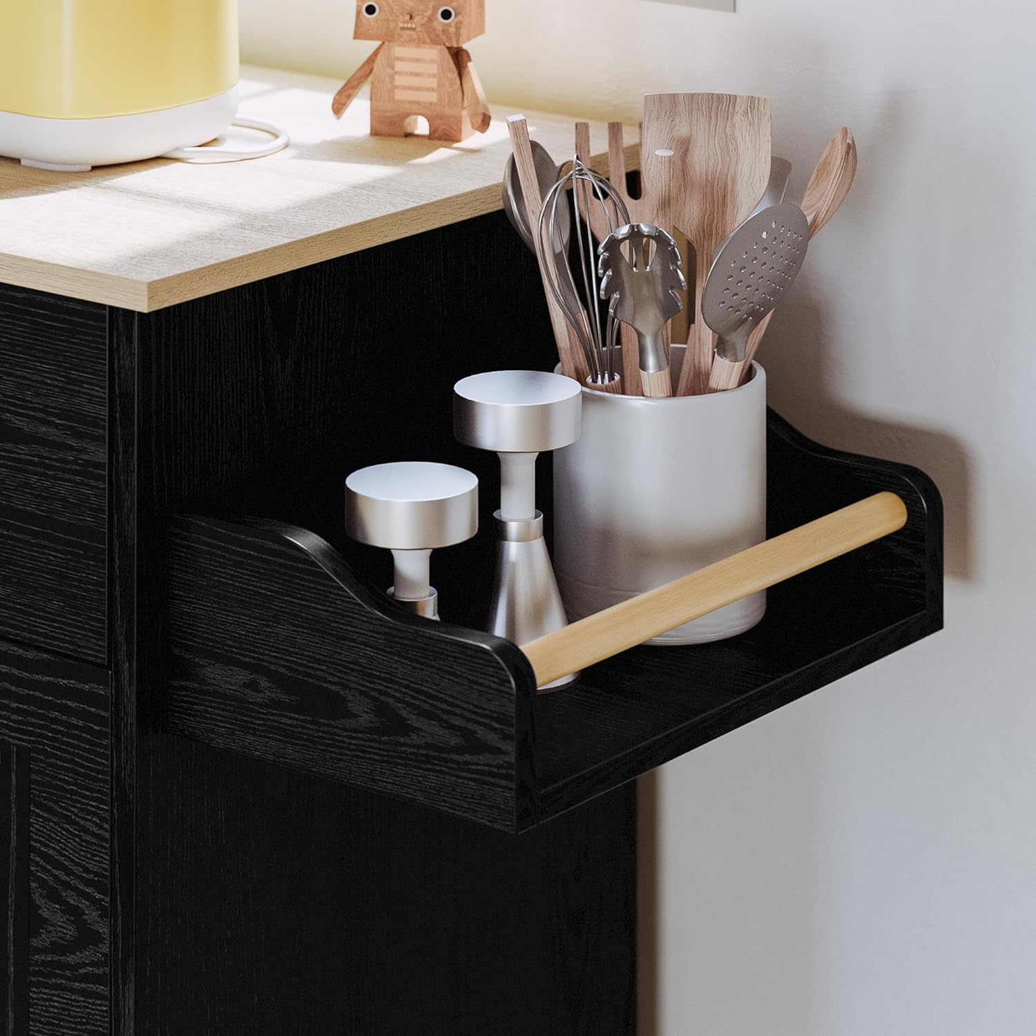 With three open spice racks, a spacious cabinet, and a handy drawer, this kitchen cart offers plenty of storage options for all your kitchen essentials. The sleek black finish adds a touch of elegance to any kitchen decor.