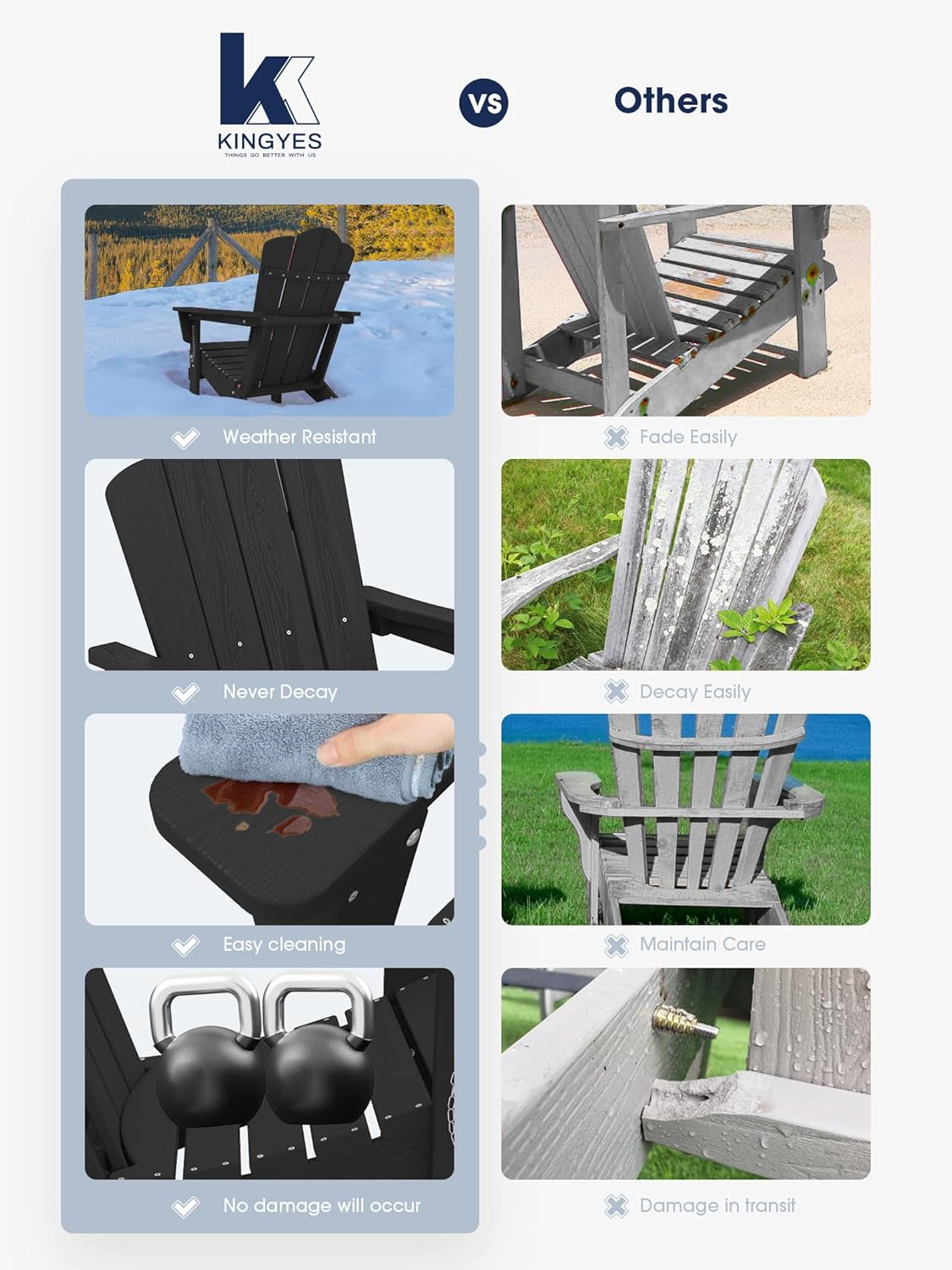 Introducing the KINGYES Folding Adirondack Chair, the perfect addition to your outdoor living space. Made from durable HDPE material, this all-weather folding Adirondack chair is designed to withstand the elements and provide long-lasting comfort.