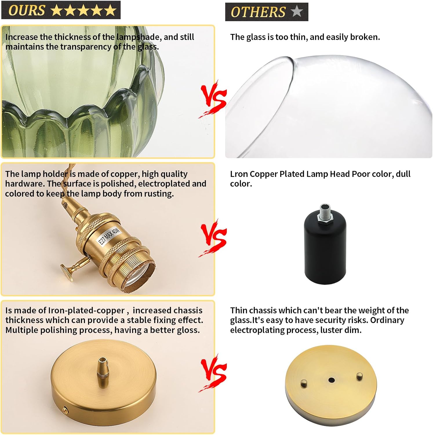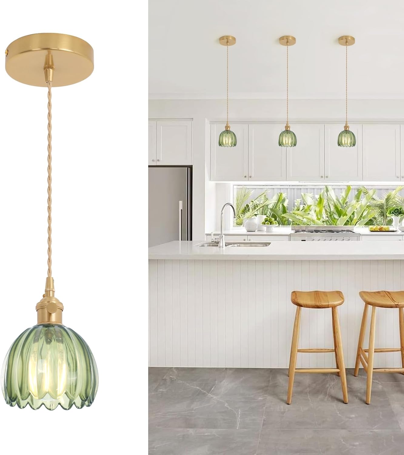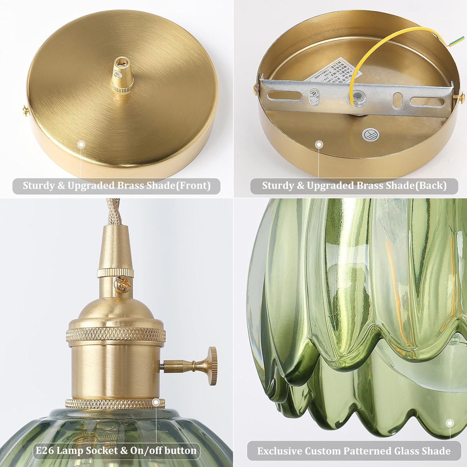 Pendant Light with Green Tulip Glass Lmapshade, Brass Vintage Pendant Light Adjustable Hanging Light for Kitchen Island Dining Room Hallway