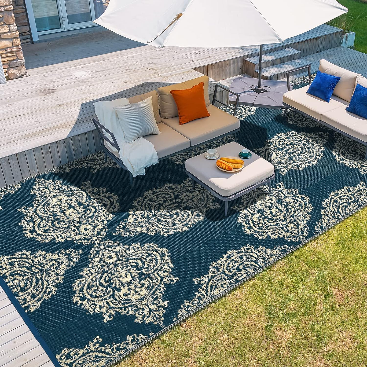 wikiwiki Outdoor Rug, 5x8ft Waterproof Reversible Mat Indoor Outdoor Rugs Carpet, Small Area Rug Plastic Straw Rug for Patio Deck Balcony Pool RV Camping Beach Picnic, Blue & Beige