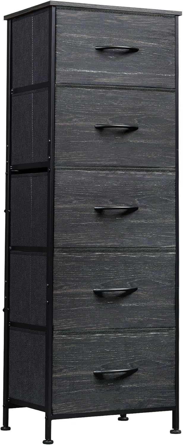 The WLIVE Fabric Dresser is the perfect addition to any bedroom, closet, or hallway. This 5-drawer tall dresser offers ample storage space for all your clothing, accessories, and more. The stylish charcoal black wood grain print adds a touch of elegance to any room.
